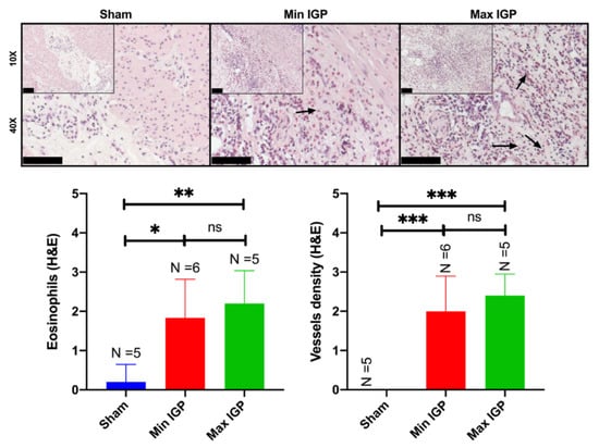 Mean capillary density score in the sham group (0 ± 0) was significantly lower than in min-IGP (2 ± 0.9, p-value = 0.0004) and in max-IGP (2.4 ± 0.5, p-value = 0.0001). No difference was found between the two IGP groups. Similarly, the eosinophils count score was significantly lower in the sham group (0.2 ± 0.4) than in min-IGP (1.8 ± 0.98, p-value = 0.01) and in max -IGP (2.2 ± 0.83, p-value = 0.004). No difference was found between the two IGP groups (Figure 3).