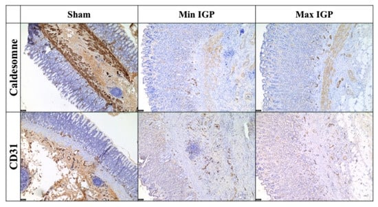 The immunohistochemical staining using CD31 and caldesmone confirmed the increase of inflammation and of newly formed vessels of both IGP groups as compared to the sham group (Figure 4).