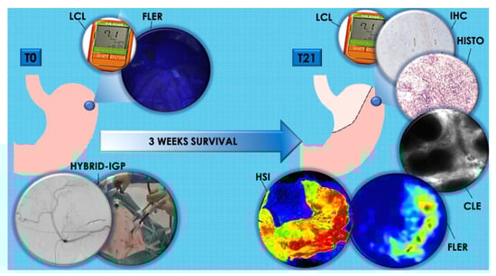 Description of experimental flow. At T0, hybrid IGP was performed in max-IGP and min-IGP groups, whereas the sham group underwent diagnostic angiography and laparoscopy. The blue spot on the stomach represent the future anastomotic site on the gastric fundus. All groups received a quantitative fluorescence angiography with FLER and LCL sampling at T0. At T21, an open surgical gastric conduit was formed and all groups underwent HSI, FLER, CLE, LCL sampling, histology, and IHC. Legends: T0: day 0; T21: day 21; hybrid IGP: hybrid ischemic gastric preconditioning; FLER: fluorescence-based enhanced reality; LCL: local capillary lactate; HSI: hyperspectral imaging; CLE: confocal laser endomicroscopy; Histo: histology; IHC: immunohistochemistry.