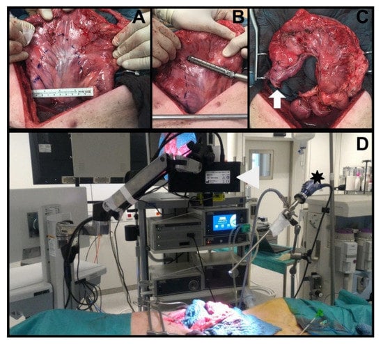Experimental set-up: (A) T21 laparotomy with planning of the gastric conduit size; (B) gastric conduit formation using the Endo GIA™ linear stapler in an open fashion, starting at the lesser curvature; (C) completed gastric conduit with the future anastomotic site highlighted by the white arrow; (D) experimental set-up with both hyperspectral imager (white arrowhead) and near-infrared laparoscope (black asterisk) recording the surgical scene containing the gastric conduit.