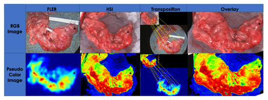 Immediately after gastric conduit formation, HSI and FLER were used in rapid succession to quantify GCF perfusion. The HSI system (TIVITA®, Diaspective Vision GmbH, Pepelow, Germany) was placed at a distance of 35 cm from the surgical scene, and using an auto-static arm, the same NIR camera used on T0 was installed next to it (Figure 6D). The GCF, marked with a long suture at T0, was centered in the scene and an HSI acquisition was performed (roughly 10 s in duration). Successively, after ICG injection, FLER was performed as described for T0 (acquisition approximately 40 s). The perfusion at the GCF was quantified using the metrics provided by both systems: StO2 for HSI and TTP for FLER. In order to precisely identify the GCF area with both imaging modalities, the pictures generated with the two imaging modalities were superimposed on top of one another. However, since the resolutions of the HSI images (640 × 480 pixels) and of the NIR laparoscope (1920 × 1080 pixels) differ, a custom-made transformation algorithm, based on the moving least square method [48] distorted the HSI image to fit the FLER image (Figure 7). This process was completed intraoperatively and required approximately 30 s.