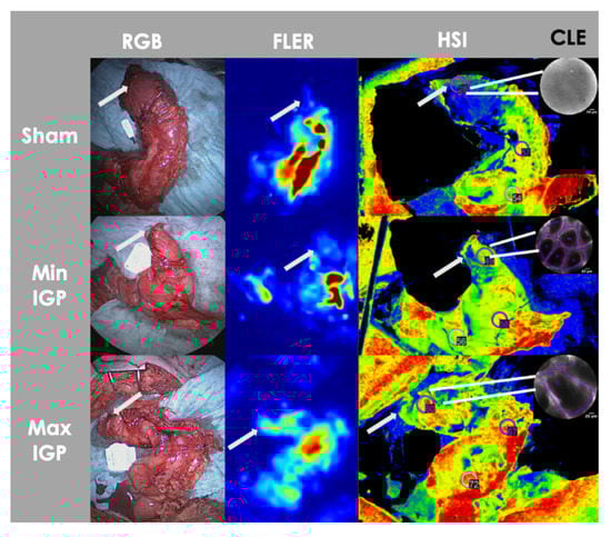 Serosal and mucosal optical imaging quantification. Visual representation of serosal (FLER, HSI) and mucosal (CLE) optical imaging quantification modalities of a gastric conduit of each group. The perfusion is visually incremented at the gastric conduit fundus/future anastomotic region (white arrow) in the IGP groups when compared to the sham group in all imaging modalities.