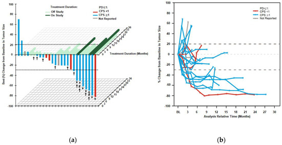(a) Best percentage change of targeted lesions from baseline versus treatment duration. Patients (x-axis) are arranged by percentage change in size of targeted lesions from baseline (y-axis) and color-coded for best response according to PD-L1 expression. Treatment duration (green) is shown on the z-axis. Dotted lines indicate RECIST boundaries (20% to 30%); (b) Change in tumor burden by PD-L1 status over time. PD-L1-positive is equivalent to CPS ≥ 1 and PD-L1-negative is equivalent to CPS < 1. Abbreviations: BL, baseline; CPS, combined positive score; PD-L1, programmed death-ligand 1. * Confirmed response. # Microsatellite instability high. † CPS ≥ 10.