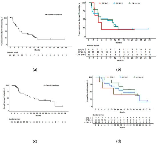 Median PFS and OS were 5.6 months (95% confidence interval [CI] 2.7–11.5) and 14.6 months (95% CI 5.4–27.7), respectively, in all patients. Patients with PD-L1-positive tumors had numerically higher median PFS compared to PD-L1-negative tumors (8.6 vs. 4.3 months), and median OS (17.3 vs. 11.3 months) (Table 3; Figure 2). Patients with PD-L1 CPS ≥ 10 tumors had a median OS of 24.7 months (Table 3). Twelve-month OS rates were numerically higher in the subset of patients with PD-L1-positive tumors and CPS ≥ 10 compared to PD-L1-negative (66.7% vs. 80.0% vs. 41.7%, respectively) (Table 3). Median OS follow-up was 26.4 months (95% CI 14.8–27.1).