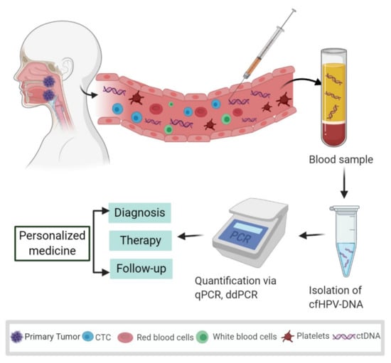 Head and neck squamous cell carcinoma (HNSCC) presents the sixth most common malignancy worldwide and approximately 700,000 new cases are diagnosed each year [1]. Incidences of oropharyngeal squamous cell carcinoma (OPSCC) are rising as a result of an increasing prevalence of high-risk human papillomavirus (HPV)-related tumors and rates have already surpassed those of cervical cancer in some developed countries [2,3,4,5]. Dependent on the geographical region, 40–80% of OPSCC are HPV-related, whereas in other head and neck subsites, rates are estimated below 5% [6]. HPV16 represents the most common high-risk type in OPSCC, with a prevalence of over 90% [3]. It is well established that HPV-related OPSCC comprises a tumor entity with distinct clinical behavior and improved survival rates compared to HPV-negative OPSCC, regardless of the advanced tumor stage [7]. The favorable prognosis has promoted the development of deintensification treatment regimens aiming to spare these patients the devastating side effects of aggressive treatment. Nevertheless, up to 25% of patients develop local/regional recurrent disease or distant metastasis following established therapy concepts and present with 5-year overall survival rates comparable to those observed in HPV-negative OPSCC [8]. This emphasizes that this subgroup of patients would not profit from deintensified treatment regimens [9,10]. Recent methods to monitor OPSCC by clinical screening and imaging are insufficient and new tools that enable early diagnosis, identification of patients with unfavorable outcome, monitoring of treatment response, and detection of minimal residual disease (MRD) are of great importance to guide precision therapy and to improve outcome in these patients.
