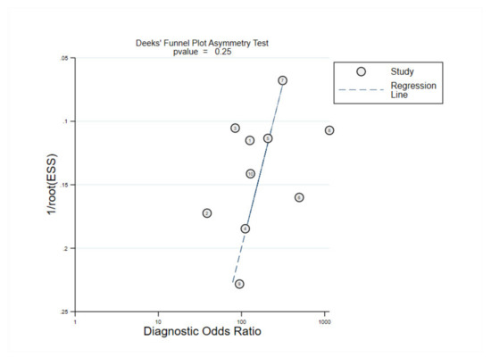 - Deeks, J.J.; Macaskill, P.; Irwig, L. The Performance of Tests of Publication Bias and Other Sample Size Effects in Systematic Reviews of Diagnostic Test Accuracy Was Assessed. J Clin. Epidemiol. 2005, 58, 882–893. [Google Scholar] [CrossRef]