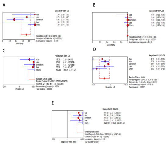 Diagnostic accuracy displayed by forest plots estimating (A) sensitivity, (B) specificity, (C) PLR, (D) NLR, and (E) DOR for analysis of cfHPV-DNA in detecting recurrence (confidence interval (CI) in brackets). Size of red dots represents sample size included in studies.