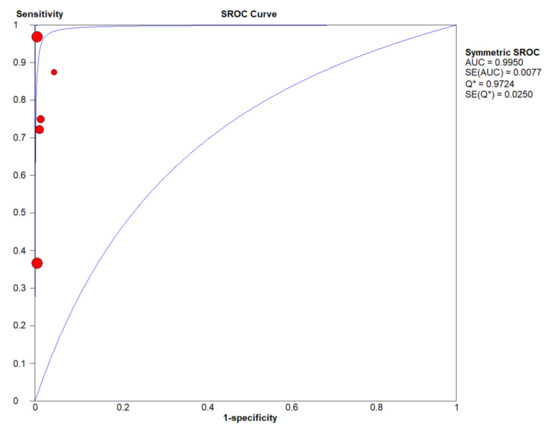 The summary receiver operating characteristic (SROC) curve for analysis of cfHPV-DNA detection at first diagnosis in HPV-related OPSCC. Blue lines represent the SROC curve and standard error (SE). The point where the SROC curve intersects the diagonal and sensitivity equals specificity is defined as Q*. Sensitive versus 1-specificity of each study is plotted as a red dot, whereas size of the dot represents sample size of the study cohort. (# studies included in meta-analysis at first diagnosis)