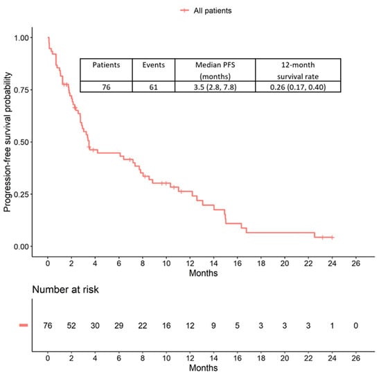 The patient characteristics are summarized in Table 1. A total of 76 patients with a mean age of 54.6 years (±10.8 y) were identified who could be followed until progression or death. Most patients were treated with T-DM1 as second-line treatment (n = 39; 51.3%). However, 12 patients (15.8%) were treated with T-DM1 in the fourth therapeutic line or later. Most patients (n = 62; 92.5%) had an Eastern Cooperative Oncology Group (ECOG) status of 0 or 1 at the start of T-DM1 therapy, and the most frequent metastatic pattern was visceral (n = 48; 64.9%).