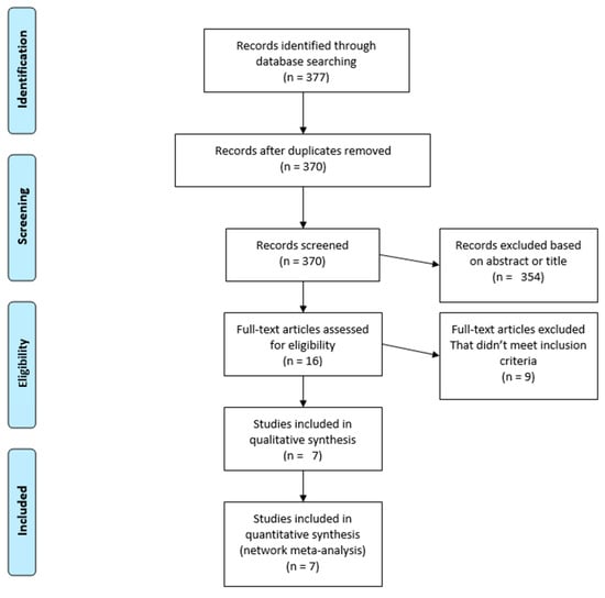 During the search phase, a total of 370 publications were identified and screened. A total of 363 publications were excluded based on the title or abstract (n = 354) or the full-text article (n = 9). Thus, the NMA included data from six randomized clinical trials (RCTs) as reported in seven publications, that compared olaparib, niraparib or rucaparib to placebo. All these RCTs, combined, included a total of 2,270 patients (Figure 1).