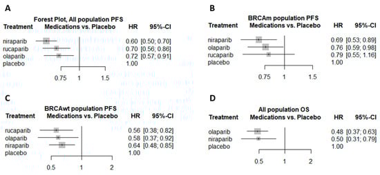 NMA forest plot of PFS and OS, comparing the different PARPis to placebo. Each subplot represents a different subgroup analysis. (A) All population PFS forest plot, (B) BRCAm population PFS forest plot, (C) BRCAwt population PFS forest plot, (D) All population OS forest plot