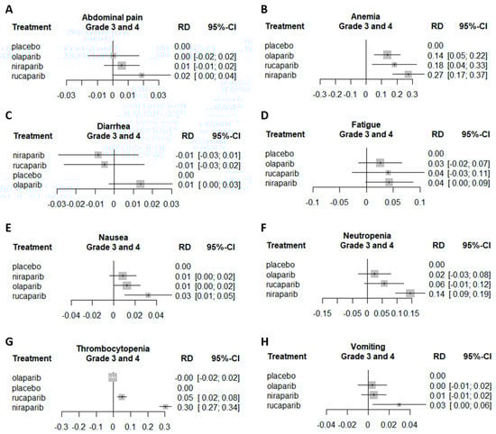 NMA forest plot of grade 3 and 4 AEs’ risk difference (RD) comparing the different PARPis to placebo. Each subplot represents a different AE. (A) Abdominal pain grade 3 and 4 forest plot, (B) Anemia grade 3 and 4 forest plot, (C) Diarrhea grade 3 and 4 forest plot, (D) Fatigue grade 3 and 4 forest plot, (E) Nausea grade 3 and 4 forest plot, (F) Neutropenia grade 3 and 4 forest plot, (G) Thrombocytopenia grade 3 and 4 forest plot, (H) Vomiting grade 3 and 4 forest plot.