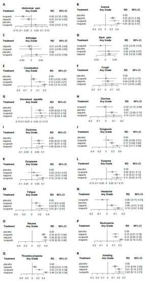 NMA forest plot of any grade AEs’ risk difference (RD) comparing the different PARPis to placebo. Each subplot represents a different AE. (A) any grade abdominal pain forest plot, (B) Any grade anemia forest plot, (C) Any grade arthralgia forest plot, (D) Any grade back pain forest plot, (E) Any grade constipation forest plot, (F) Any grade cough forest plot, (G) Any grade decreased appetite forest plot, (H) Any grade diarrhea forest plot, (I) Any grade dizziness forest plot, (J) Any grade dysgeusia forest plot, (K) Any grade dyspepsia forest plot, (L) Any grade dyspnea forest plot, (M) Any grade fatigue forest plot, (N) Any grade headache forest plot, (O) Any grade nausea forest plot, (P) Any grade neutropenia forest plot, (Q) Any grade thrombocytopenia forest plot, (R)Any grade vomiting forest plot.