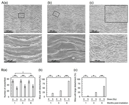 Morphological changes in the aortic endothelium of B6J mice. (A) Representative FE-SEM images of (a) normal endothelium (6 months after 0 Gy), (b) detachment (1 month after 5 Gy), and (c) large detachment (1 month after 5 Gy). Boxed areas in the upper panels are shown at higher magnification in the lower panels. Scale bars as indicated. (B) Quantitative analysis for (a) the number of crests/field (10 mice/group analyzed), and (b,c) percentage of mice with detachment and large detachment, respectively (20 mice/group analyzed). (a) There was a difference among three post-irradiation timepoints in irradiated groups (ANOVA p = 0.003, pairwise p < 0.02 for 1 vs. 3 months and 1 vs. 6 months) but not in sham-irradiated controls (ANOVA p > 0.5). ** p < 0.001 for irradiated vs. sham-irradiated groups at each timepoint (by the two-sample t-test). † The degree of difference between irradiated and sham-irradiated groups at two timepoints (pairwise p = 0.015). (b,c) According to the Wald test, there was a difference among three post-irradiation timepoints in irradiated groups (p < 0.03 for 1 vs. 6 months and 3 vs. 6 months) but not in sham-irradiated controls (p > 0.5). ** p < 0.001, * 0.001 ≤ p < 0.05, or ns (nonsignificant, p > 0.1) for irradiated vs. sham-irradiated groups at each timepoint (by Fisher’s exact test).