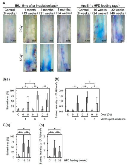 Changes in vascular permeability in the descending thoracic aorta of B6J and ApoE−/− mice evaluated with the Miles assay. (A) Representative images of extravasated dye. (B) Quantitative analysis for (a) stained area and (b) intensity (b) in B6J mice. 10 mice/group analyzed. According to the one-way ANOVA, a difference among three post-irradiation timepoints in irradiated groups was significant for stained area (ANOVA p = 0.03, pairwise p = 0.02 for 1 vs. 3 months) and nonsignificant for stained intensity (ANOVA p = 0.07), but a difference among four (1 non-irradiated and 3 sham-irradiated) control groups was nonsignificant for both stained area and intensity (ANOVA p > 0.5). ** p < 0.001 or * 0.001 ≤ p < 0.05 for irradiated vs. sham-irradiated groups at each timepoint (by the two-sample t-test). † 0.001 ≤ p < 0.05 for the degree of a difference between irradiated and sham-irradiated groups at two timepoints (pairwise p). (C) Quantitative analysis for (a) stained area and (b) intensity (b) in ApoE−/− mice. 10–13 mice/group analyzed. ** p < 0.001, * 0.001 ≤ p < 0.05, or ns (nonsignificant, p > 0.1) between two groups (by the two-sample t-test). A difference between non-irradiated B6J (Figure 2(Ba,Bb)) and normal-fat diet-fed ApoE−/− (Figure 2(Ca,Cb)) controls was not significant (p > 0.5). AU, arbitrary unit. C, non-irradiated or normal-fat diet-fed controls. HFD, high-fat diet.