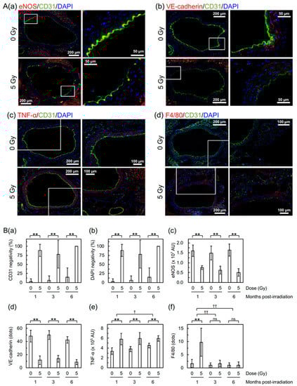Next, to evaluate the molecular changes, the aorta was subjected to dual immunofluorescent staining for cluster of differentiation 31 (CD31) and other markers (Figure 3A). CD31 is a marker for vascular endothelial cells (VECs), and α-smooth muscle actin (α-SMA) is a marker for vascular smooth muscle cells (VSMCs). Irradiation led to partial loss of the aortic endothelium manifested as loss of signals of CD31 and 4′,6-diamidino-2-phenylindole (DAPI) in VECs (Figure 3(Ba,Bb)), while a signal of α-SMA remains in VSMCs (Supplementary Materials Figure S3A). Irradiation also led to a decrease in endothelial nitric oxide synthase (eNOS, a marker for vascular functionality) and vascular endothelial cadherin (VE-cadherin, a marker for adherens junction) in VECs (Figure 3(Aa,Ab) and Supplementary Materials Figure S3(Bc,Bd)). These reinforce the findings on detachment and large detachment observed with the FE-SEM analysis and those on increased vascular permeability observed with the Miles assay. There was also an irradiation-induced increase in tumor necrosis factor α (TNF-α, an inflammation marker, Figure 3(Ac,Be)) in VSMCs and F4/80 (a macrophage marker, Figure 3(Ad,Bf)), suggesting that radiation-induced vascular damage induces inflammation and recruitment of macrophages.