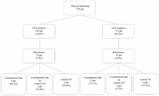 Thirteen patients (7.9%) in the CLN-positive group experienced recurrence during the follow-up period. Six had recurrence in the contralateral lobe, two in both the contralateral lobe and the lateral lymph node (LN), and five in the lateral LN. In the CLN-negative group, 35 (4.9%) patients experienced recurrence. Twenty-seven had recurrence in the contralateral lobe, two in both the contralateral lobe and the lateral LN, and six in the lateral LN. There was no operative bed, central neck, or distant recurrence (Figure 1).