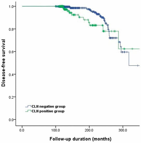 Kaplan–Meier curve for disease-free survival (p = 0.065). Abbreviations: CLN: Central lymph node.