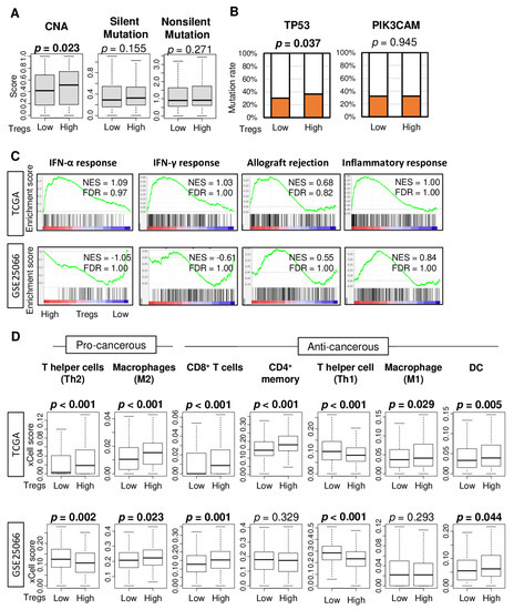 Tumor mutational burden across several tumor types correlates with TIL infiltration and favorable response to treatment with immune check point inhibitors [31,32]. Next, we were interested to find out whether Treg infiltration is associated with tumor mutational load. To test this notion, we first examined the association of Treg infiltration and several mutation-related scores in TCGA cohort as described by Thorsson et al. [33]. High Treg infiltration was significantly associated with a high score of copy number alteration (CNA), but not silent- or nonsilent-mutation score (Figure 2A, p = 0.023, 0.155, and 0.271, respectively). Next, we examined the association of Treg infiltration and mutation rate of TP53 and PIK3CAM, which are the top two most mutated genes in breast cancer in the TCGA cohort. High Treg infiltration was associated with a high TP53 mutation rate, but not with the PIK3CAM mutation rate (Figure 2B, p = 0.037 and 0.945, respectively).