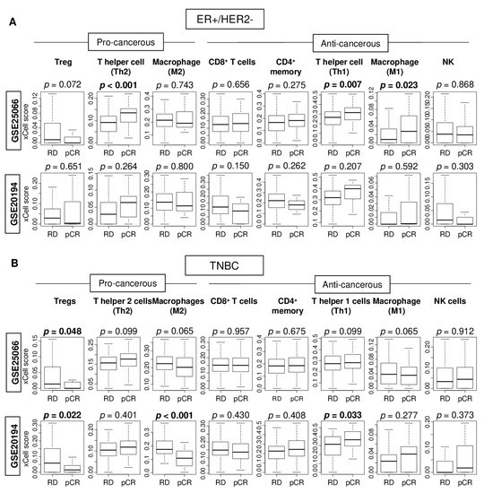 Association of pathological complete response (pCR) with fraction of multiple tumor infiltrating immune cells in the GSE25066 and GSE20194 cohorts. These cohorts were chosen because of their response to neoadjuvant chemotherapy data. Boxplots of levels of immune cells with residual disease (RD) and pCR after NAC in (A) ER-positive/HER2-negative tumors and (B) TNBCs in both patient cohorts. Mann–Whitney U test was used for the analysis. Pro-cancerous immune cells included Tregs, T helper type 2 cells (Th2), and M2 macrophages. Anti-cancerous immune cells included CD8 T cells, CD4 memory T cells, T helper type 1 cells (Th1), M1 macrophages, and Natural Killer T cells (NK).
