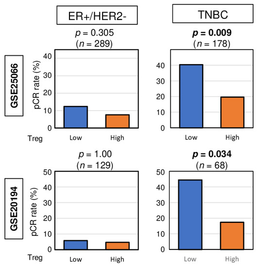 Given that pCR after NAC was significantly associated with less infiltration of Tregs in TNBC, we investigated whether high top tertile amount of Treg could be a predictive biomarker for NAC. We found that high abundance of Treg prior to the treatment was associated with significantly lower pCR rate in TNBC patients consistently in both the GSE25066 and GSE20194 cohorts (Figure 4. p = 0.009, and 0.034, respectively). No association was observed between Treg and pCR rate in ER-positive/HER2-negative patients in both cohorts. These results suggest that high abundance of Treg in TNBC may be a predictive biomarker of pCR after NAC.