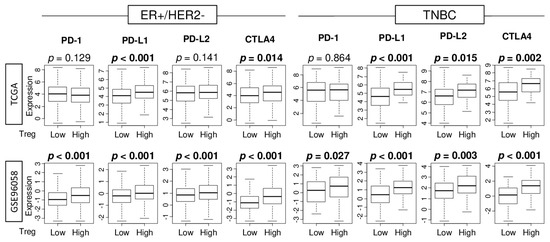 Given the recent approval of immune checkpoint inhibitors (ICIs) as treatment for some breast cancer patients [36], it was of interest to examine the association of abundance of Tregs with expression of major immune checkpoint molecules. We found that high abundance of Treg had significantly elevated gene expression of programmed death ligand 1 (PD-L1) and cytotoxic T-lymphocyte-associated protein 4 (CTLA4) in ER-positive/HER2-negative tumors, but it had significantly elevated levels of PD-L1, PD-L2, and CTLA4 in TNBC in the TCGA cohort (Figure 5). In the GSE96058 cohort, tumors of either subtype with high abundance of Tregs had significantly elevated expression of all the immune checkpoint genes examined. These findings suggest that abundance of Tregs is associated with expression of immune checkpoint molecules.