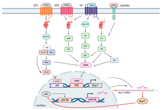 Schematic overview of signaling pathways regulating Nurr1 expression. TXA2, PGE2, and VEGF pathways modulate phosphorylation of NF-κB and CREB to regulate the transcriptional activity of Nurr1. p53/microRNA-34/Nurr1 forms a positive feedback loop to suppress p53 activation and the subsequent expression of microRNA-34, leading to the upregulation of Nurr1 protein expression. EP: prostaglandin E2 receptor; PGE2: prostaglandin E2; TP: thromboxane A2 receptors: TP; TXA2: thromboxane A2: VEGFR: vascular endothelial growth factor receptor; VEGF: vascular endothelial growth factor; G12/13: G12/G13 alpha subunit; Gs: Gs alpha subunit; Gq: Gq alpha subunit; κB: kappa-B; CRE: cAMP response elements; p53 RE: cAMP p53 response element.