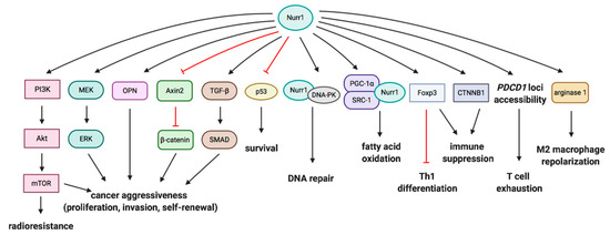 There is an extensive crosstalk of Nurr1 with pro-tumorigenic or tumor-suppressive signaling. Nurr1 has been reported to regulate cancer aggressiveness, self-renewal, survival, DNA repair and metabolism. Downstream signaling of Nurr1 in relation to the diverse phenotypes in cancers will be discussed. The recent identification of Akt and ERK as downstream targets of Nurr1 in carcinogenesis by our group will also be covered. Figure 3 summarizes the interplay of Nurr1 with different signaling pathways in cancers.