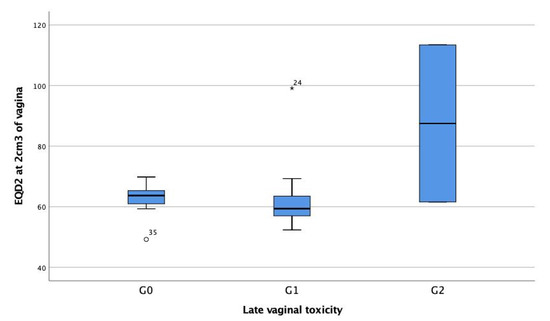Figure 1. The distribution of EQD2(α/β = 3Gy) in Gy at the most exposed 2 cm3 of vagina in relation to the grades of late vaginal toxicity.