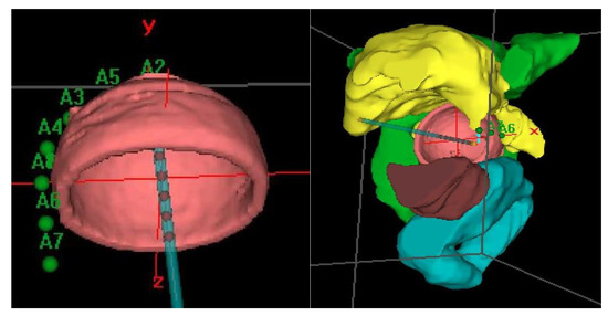 Prior to treatment, a computerized tomography (CT) simulation scan was performed with image acquisition every 1 mm for 3D planning. Special care was taken to confirm close contact of the applicator to the vagina in the CT in order to avoid relapses. Our procedure for clinical target volume (CTV) delineation consists of generating an automatic contour based on the difference in Hounsfield units of the applicator and the patient’s tissues. From this automatic contour, we generate an isotropic 3 mm margin, that is, the expansion volume. Then, a boolean subtraction of the applicator from the expansion volume is made. Finally, manual delineation of the external part of this volume is performed to adapt it to the real thickness of the vagina, which can vary depending on the case and cylinder diameter. For manual delineation, a 2 mm diameter pearl tool is used. The CTV was delineated along the first cylinder and the mean length of the postoperative treated vaginal cuff was 3cm; the rectum, bladder, and sigma were also delineated along 2 cm from the top to 2 cm under the CTV using the Oncentra Brachy planning system (V.4.5.3) (Elekta®,Nucletron BV, Veenendaal, The Netherlands). (Figure 2).