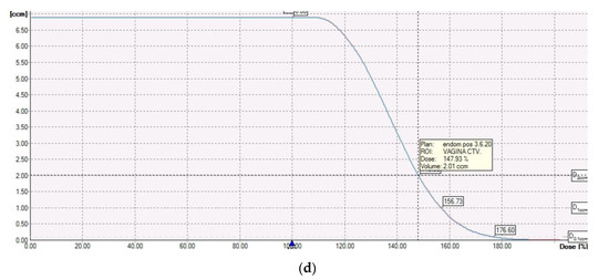 Figure 3. Example of dosimetric study showing the most exposed 2 cm3 of vagina to the dose in coronal (a), sagittal (b) and axial (c) planes and (d) dose volume histogram.