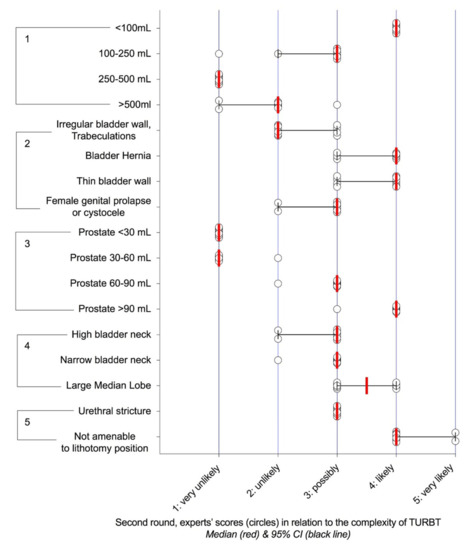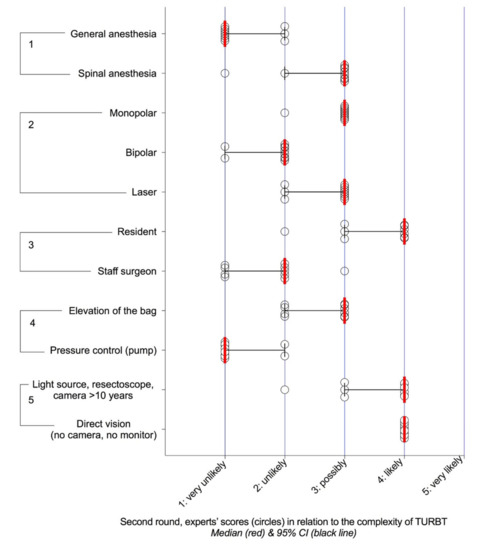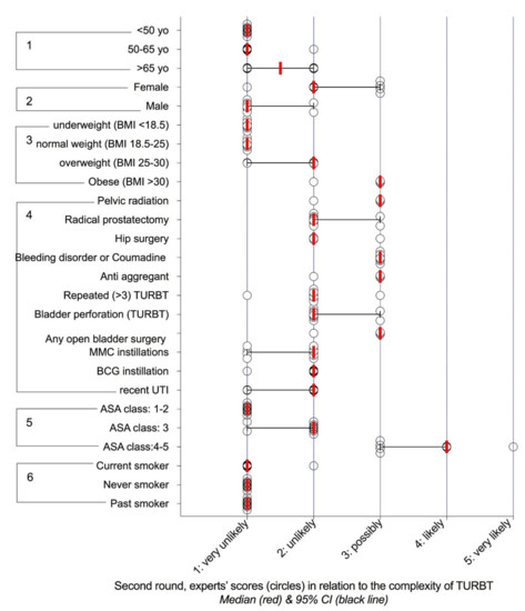 The second step researched robust clinical predictors. To that end, we relayed on expert judgement, a valuable instrument when other methods are intractable for scientific or practicable reasons [45]. TURBT appears to fall in that category, as although many factors are known to impact surgery and its outcomes [4,5,46], some important ones were not detailed in population-based series (e.g., position of the tumour) or were so infrequent as to elude detection (e.g., diverticulum). Conversely, experienced urologists are bound to encounter them along their career and to drive some operational conclusions as to the influence they may have on their management. This was confirmed by the extensive list of items drawn from experience and by the broad consensus of the panel on their relative contributions to complexity.