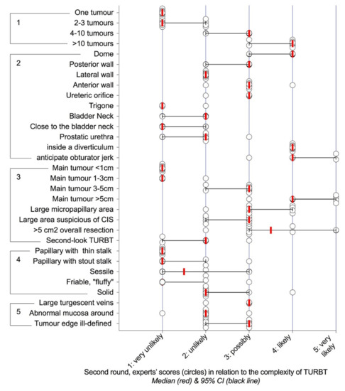 The following are available online at https://www.mdpi.com/2072-6694/12/10/3063/s1, Figure S1: First-round distribution of the experts’ scores regarding the influence of the characteristics of the patient on the likelihood of complex TURBT; Figure S2: First-round distribution of the experts’ scores regarding the influence of the characteristics of the tumour on the likelihood of complex TURBT; Figure S3: First-round distribution of the experts’ scores regarding the influence on the likelihood of complex TURBT of bladder characteristics and access; Figure S4: First-round distribution of the experts’ scores regarding the influence of the surgical environment on the risk of TURBT or En-Bloc resection resulting in either three situations: incomplete resection according to the operator, prolonged surgery (>1 h) or significant intra- (bleeding that requires transfusion, laparotomy) or postoperative complications (Clavien-Dindo Grade III and higher); Table S1: Articles (English language, 4/2009-4/2019) found relevant to the definition of complexity in transurethral resection of bladder tumours; Table S2: 150 scenarios constructed for univariate and multivariate analyses of clinical features in relation to complexity.