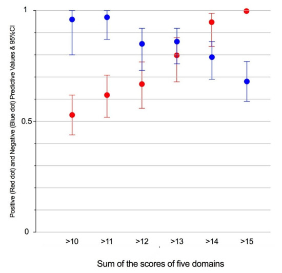 Negative (blue) and positive (red) predictive values (NPV and PPV) of increments in the BCCS.
