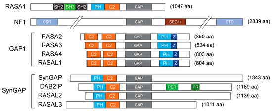 - The GAP1 family includes RASA2 (Ras p21 protein activator 2)/GAP1m, RASA3 (Ras p21 protein activator 3)/GAPIP4BP, RASA4 (Ras p21 protein activator 4)/CAPRI, and RASAL1 (Ras protein activator like 1). Members of this group share large significant sequence homology and act as dual GAPs, binding and inactivating Ras and Rap1 GTPases. All members of this group are clearly implicated in cancer. For example, the recurrent inactivation of RASA2 in melanoma favors constitutive activation of Ras signaling [22], and the frequent downregulation of RASA4 in myelomonocytic leukemia correlates with poor prognosis and higher risk of relapse after therapy [23]. Furthermore, the recurrent deletion of chromosome 13, which includes the RASA3 gene, in Burkitt and T-cell lymphomas and in acute myeloid leukemia (AML) suggests a potential role of RASA3 in these blood tumors [24]. Finally, RASAL1 displays MAPK- and PI3K-suppressing activities in multiple tumors, including thyroid cancer [25,26].