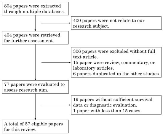 We identified 804 articles as potentially relevant studies, of which a total of 57 articles were finally retrieved as eligible studies according to the above criteria for this systematic review (Figure 1). A total of 11,102 cases were involved in this study, and the median number of patients was 93. In these studies, 37 articles were included in the prognostic meta-analysis and 28 articles provided diagnostic information. These studies were conducted in ten countries (Australia, China, France, Germany, Japan, Korea, Poland, Czech Republic, Taiwan, and the Netherlands), and different technologies were used to assess the utility of liquid biopsies.