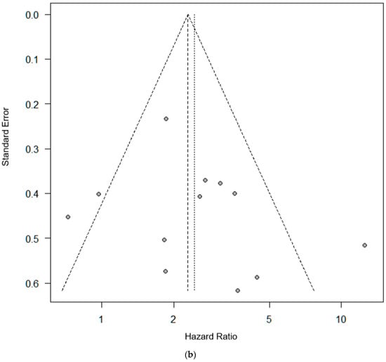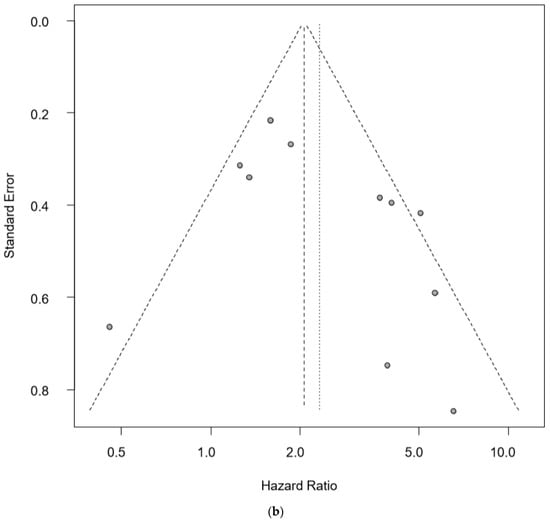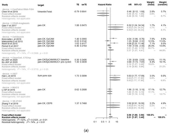 The pooled HR for PFS was 2.31 (95% CI = 1.57–3.40), and poorer OS was observed in CTC-positive patients compared to CTC-negative patients (Figure 3a). The negative selection with CD45 magnetic beads [27] and positive selection with ISET [86] appeared to give the most powerful prognostic predictive value. There were no significant differences between each detection method because of the heterogeneity of this cohort (I2 = 62%, p < 0.01), and publication bias was visualized as a funnel plot (Figure 3b).