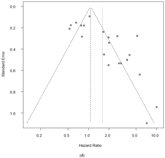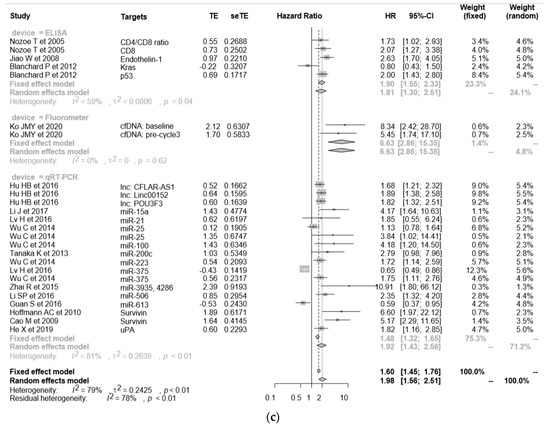 The pooled HR for OS was 1.98 (95% CI = 1.56–2.51), and poorer OS was observed in CTC-positive patients compared with CTC-negative patients (Figure 2c). A combination of miRNA-3935 and miRNA-4286 [53] appeared to exhibit the most powerful prognostic predictive value. There were no significant differences between each detection method because of the heterogeneity of this cohort (I2 = 79%, p < 0.01) and the existence of publication bias was visualized as a funnel plot (Figure 2d).