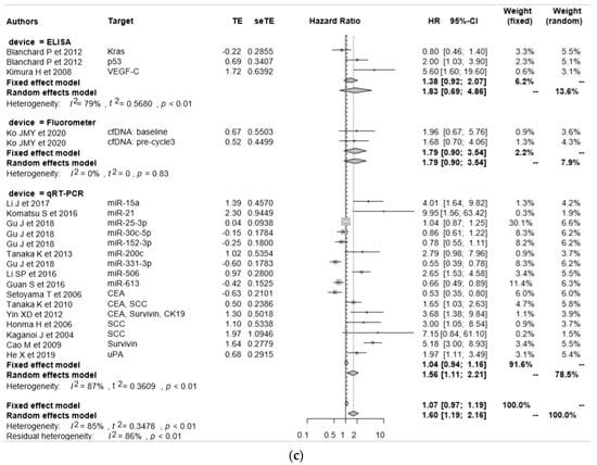 The pooled HR for PFS was 1.60 (95% CI = 1.19–2.16), and no significant difference was observed between CTC-positive and CTC-negative patients (Figure 3c). Overall, miRNA-21 [49] and SCC mRNA [8] appeared to exhibit the most powerful prognostic predictive value. There were no significant differences between each detection method because of the heterogeneity of this cohort (I2 = 85%, p < 0.01), and the existence of publication bias was visualized as a funnel plot (Figure 3d).