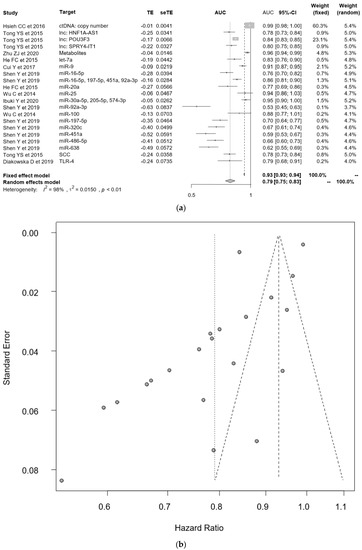 Twenty-six molecules from twenty studies demonstrated the diagnostic value of using a liquid biopsy by using the area under the curve (AUC) for the early detection of ECs [49,50,54,56,57,58,60,61,62,63,64,65,66,67,72,75,78,79,80,95,96,97] (Table 3). It is still challenging to detect early EC or make a differential diagnosis between high-grade dysplasia and EC using a liquid biopsy strategy. In Figure 4a, the AUC values have been plotted, featuring 95% CIs. The median AUC of all the studies was 0.781 (0.550–0.991). In Figure 4b, a strong heterogeneity of publication bias is shown due to the low number of studies. Therefore, we evaluated the pooled AUC value using the random effect model, and the pooled AUC was 0.79 (0.75–0.83). These results confirmed that the copy number of ctDNA (AUC = 0.99, 95% CI = 0.98–1.00) [95], combination of metabolites (AUC = 0.96, 95% CI = 0.94–0.99) [80], and the combination of miRNAs (miR-30a-5p, 205-5p, and 574-3p) (AUC = 0.95, 95% CI = 0.90–1.00) [64] seemed to be a favorable candidate for the early detection of ECs.
