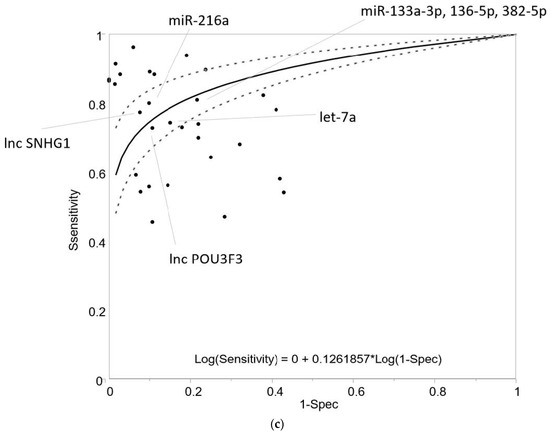 Next, the derived sensitivity and 1-specificity values from each report (a total of thirty-two molecules from 22 studies [49,50,54,56,57,58,60,61,62,63,64,65,66,67,72,75,78,79,80,95,96,97]) were plotted (Figure 4c). The logarithmic regression curve, with 95% CIs, was constructed to evaluate the heterogeneity of each diagnostic value, and three molecules (lncSNHG1 [63], miR-216a [67], and a combination of miRNAs (miR16-5p, miR197-5p, and miR92a-3p) [58]) were considered as favorable candidates for the early detection of ECs.