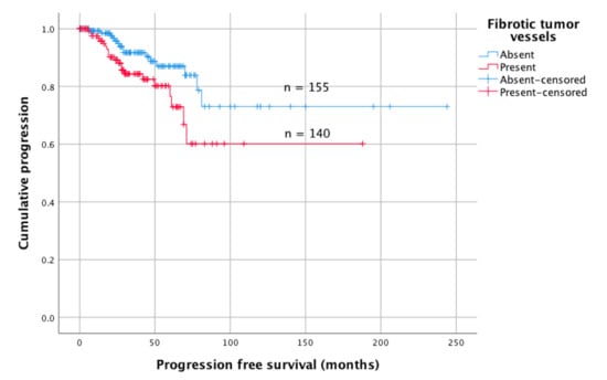 Kaplan–Meier showing correlations between fibrotic tumor vessels and prognosis. Progression-free survival was significantly shorter (p = 0.029, Log-rank test) in patients when intratumoral fibrotic tumor vessels were present (HR: 2.06, 95%CI 1.02–4.15; p = 0.043).