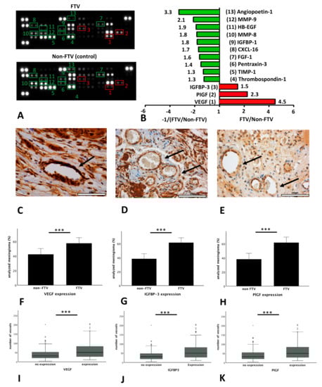 Expression of VEGF, IGFBP-3, and PlGF in meningioma vessels: Measurement of the optical density of meningioma samples with FTV and disruption of the arachnoid layer (FTV group, n = 8; A top) and without FTV and disruption of the arachnoid layer (non-FTV control group, n = 7; A bottom). The FTV group displays the distinct expression of various angiogenesis related proteins as compared to the non-FTV group (B). The immunohistochemical data confirm the results of the angiogenesis proteome profiler arrays and demonstrated significant differences in the endothelial expression (arrows) of vascular endothelial growth factor (VEGF; C), insulin-like growth factor-binding protein-3 (IGFBP-3; D), and placental growth factor (PlGF; E) evaluated using semi-quantitative analyses (F–H). Furthermore, the expression of VEGF, IGFBP-3, and PlGF correlated significantly with vessel density in the meningiomas (I–K). Original magnification: 400×. Error bars: 95%CI. *** p < 0.001.
