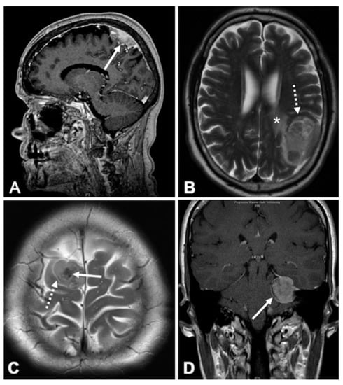 - Perry, A.; Louis, D.N.; von Deimling, A.; Sahm, F.; Rushing, E.J.; Mawrin, C.; Claus, E.B.; Loeffler, J.; Sadetzki, S. Meningiomas. In WHO Classification of Tumors of the Central Nervous System; Louis, D.N., Ohgaki, H., Wiestler, O.D., Cavenee, W.K., Ellison, D.W., Figarella-Branger, D., Perry, A., Reifenberger, G., von Deimlig, A., Eds.; International Agency on Cancer Research: Lyon, France, 2016; pp. 232–245. [Google Scholar]