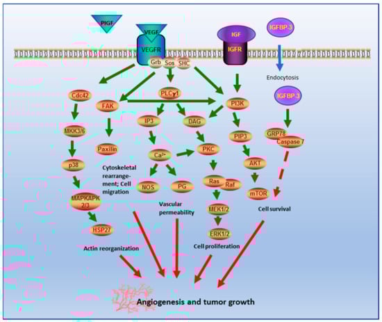Simplified scheme of putative role, function, and involvement of VEGF, PlGF, and IGFBP-3 in signaling pathways described in angiogenesis and tumor growth. The downstream signaling pathway of the VEGF receptor (VEGFR), including adaptor proteins son of sevenless (SOS), growth receptor bound (Grb) 2, and Src homology 2 domain, can be activated by the ligands VEGF and PlGF. The activation of the mitogen-activated protein kinase (MAPK) signaling pathway via cell division control protein 42 homologous (Cdc42), mitogen-activated protein kinase 3/6 (MKK3/6), p38 mitogen-activated protein kinase (p38/MAPK), and MAP kinase-activated protein kinase 2/3 (MAPKAPK 2/3) triggers actin reorganization via heat shock protein 27 (HSP27), which promotes migration of endothelial cells. The activation of focal adhesion kinase (FAK) results in a cytoskeletal rearrangement by modulating the adhesion protein paxillin. The cleavage of inositol-1,4,5-trisphosphate (IP3) by PLCγ (phospholipases C γ) provokes the release of calcium (Ca2+), which contributes to vascular permeability via the release of prostaglandins (PG) and endothelial nitrogen monoxide synthase (NOS). PLCγ also leads via diacylglycerol (DAG) to the activation of the protein kinase C (PKC)-rapidly accelerated fibrosarcoma (Raf)-rat sarcoma (Ras)/mitogen-activated protein kinase (MEK)/extracellular-signal regulated kinases (ERK) pathway, which initiates DNA synthesis to promote endothelial cell proliferation. The phosphoinositide 3-kinase (PI3K)/protein kinase B (Akt)/mammalian target of rapamycin (mTOR) pathway plays a crucial role in cell proliferation and cell survival. PI3K can be activated by VEGFR and by IGFR. There is also a direct stimulation of FAK. IGFBP-3 can bind to 78-kDA glucose-regulated protein (GRP78). This binding can result in proapoptotic and prosurvival activity (based on [23,33,34,38,39,40,41,42,43]).