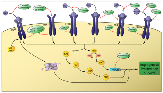 The mammalian target of rapamycin (mTOR) is a master regulator of cellular growth, proliferation, and survival [107]. Many RTKs achieve downstream effects through signaling primarily mediated by the RAS/RAF and PI3K/AKT pathways. mTOR is downstream from these signaling pathways and is one of the major effectors regulated by PI3K/AKT signaling [108]. Aberrant regulation of mTOR has been proposed as a potential mechanism for the ineffectiveness of previously mentioned RTK-targeted therapies [109].