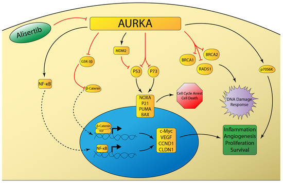Schematic representation of aurora kinase A (AURKA) signaling networks involved in cancer. AURKA overexpression inhibits the DNA damage response and attenuates DNA-damage induced cell cycle arrest and apoptosis through inhibition of p53 family member proteins [129]. AURKA induces inflammatory signaling mediated by NF-κB [133], as well as pro-survival signaling mediated by beta-catenin [132] and p70S6K [135].