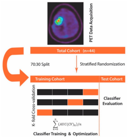 Machine learning algorithm schema. First, positron emission tomography (PET) data (the mean and maximum tumor-to-brain ratios (TBRmean, TBRmax) and time-to-peak (TTP)) were collected and fed to the machine learning algorithm, where the total cohort (n = 44) was subdivided into a training set and hold-out validation set (test) cohort in a 70:30 split. The training dataset underwent 3-fold cross-validation using a linear discriminant analysis (LDA) classifier. Finally, the so obtained and optimized classifier was evaluated for robustness and generalizability on the hold-out validation set cohort.
