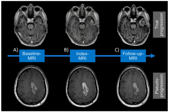 In this preliminary study, MRI data at three different acquisition time points were considered. The index MRI was defined as the MRI at initial suspicion for tumor progression or pseudoprogression according to the modified RANO criteria. The baseline MRI was acquired before the index MRI and is compared against it to indicate whether criteria for tumor progression or pseudoprogression have been met. The follow-up MRI was acquired after the index MRI and is used to confirm or reject pseudoprogression in the event that histopathological validation of the diagnosis was not available.