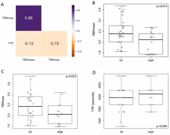 The PET diagnostic outputs several features that have been found to be important. The most widely used are TBRmax, TBRmean, and TTP. In a correlation analysis using the Pearson r coefficient TBRmax and TBRmean had a high relationship (r = 0.88), whereas TTP was not associated with TBRmax or TBRmean (r = −0.15 and r = −0.13, respectively) (Figure 3A) indicating a putative additional benefit from including TTP data to the analysis. The distribution of data points between TP and PSP was investigated and compared revealing a significant difference between those groups for TBRmax (p = 0.033) and TBRmean (p = 0.014) with lower values pertaining to the PSP group. TTP was not different between PSP and TP (p = 0.696, Figure 3B–D).